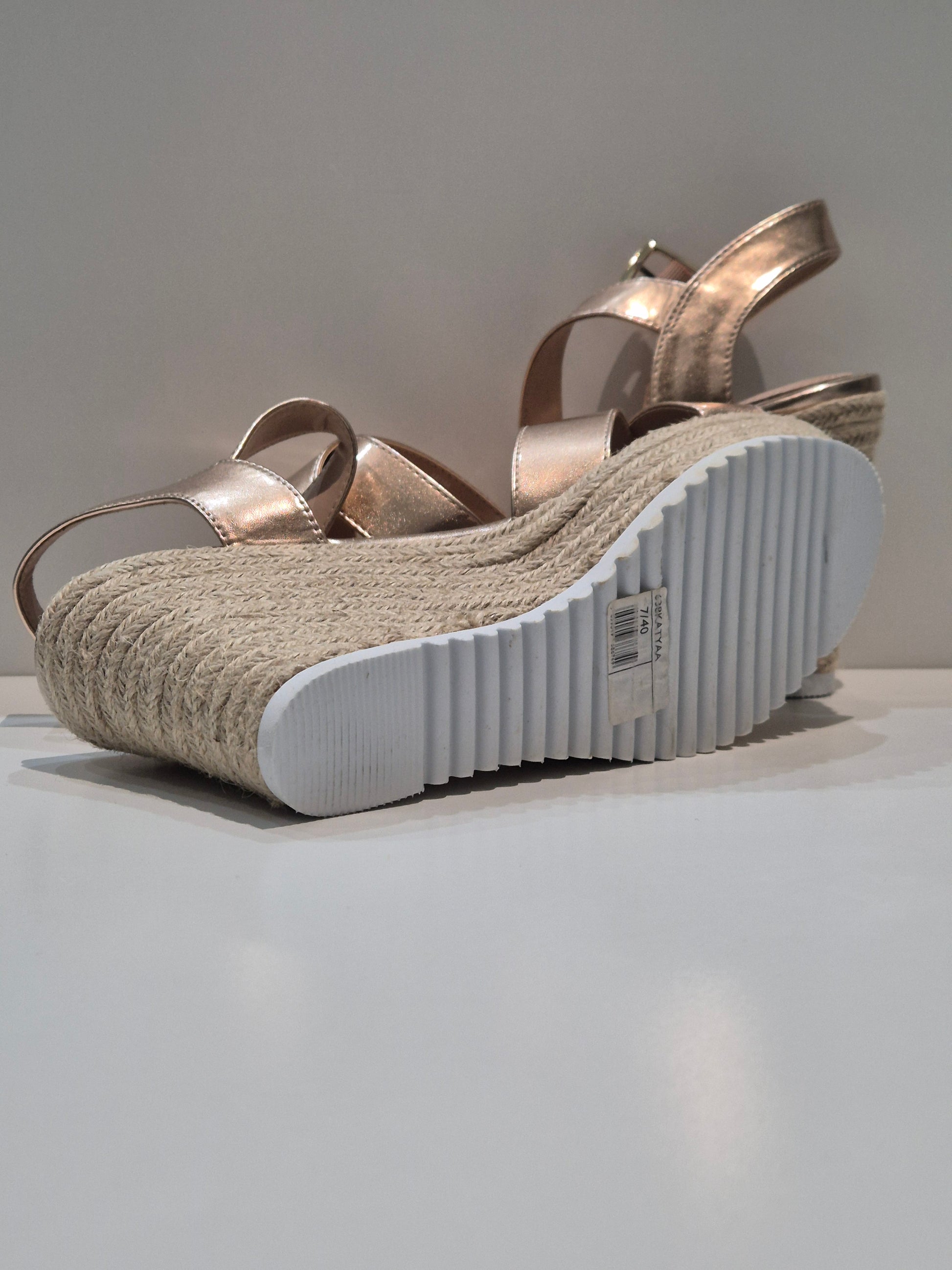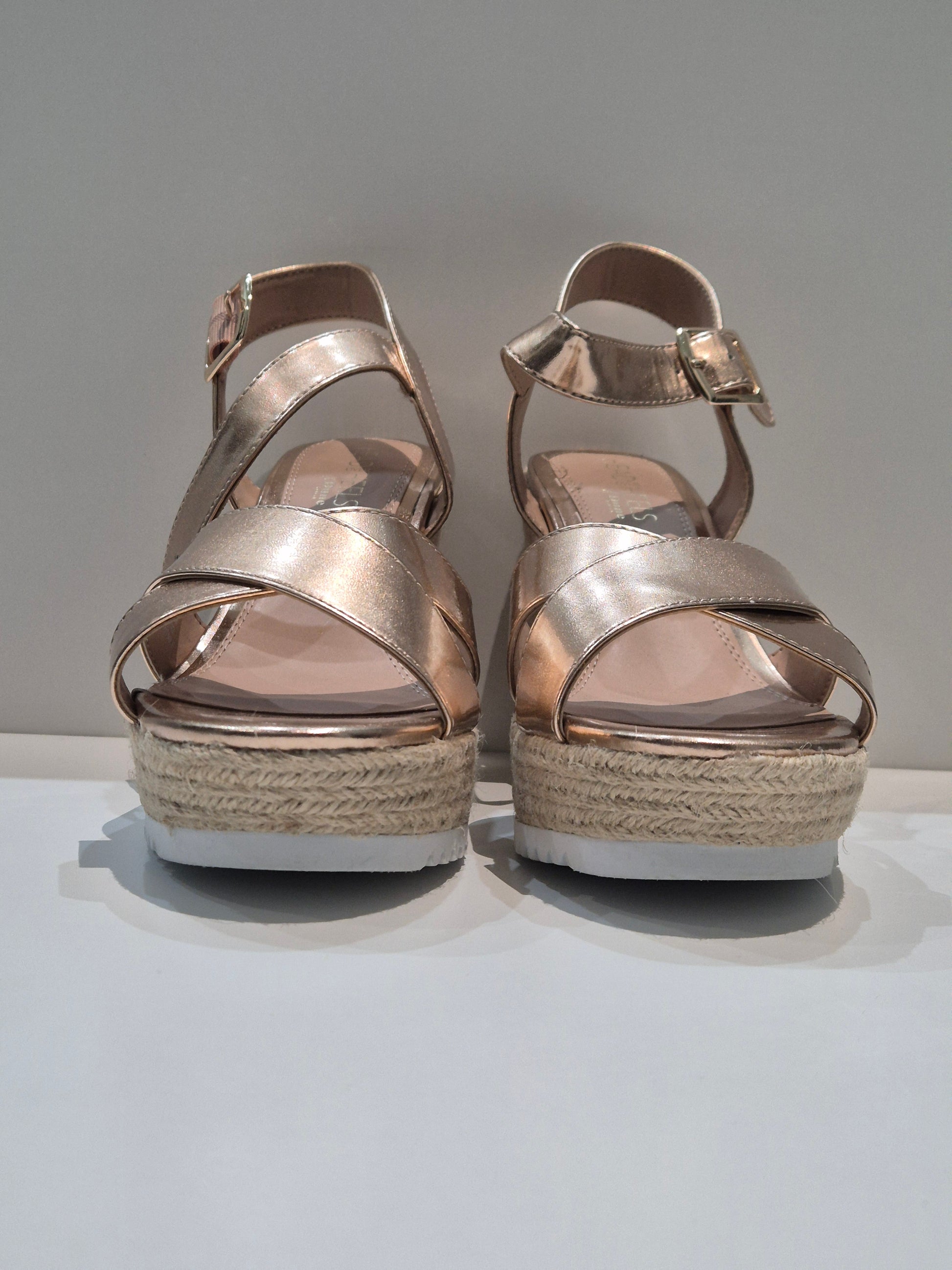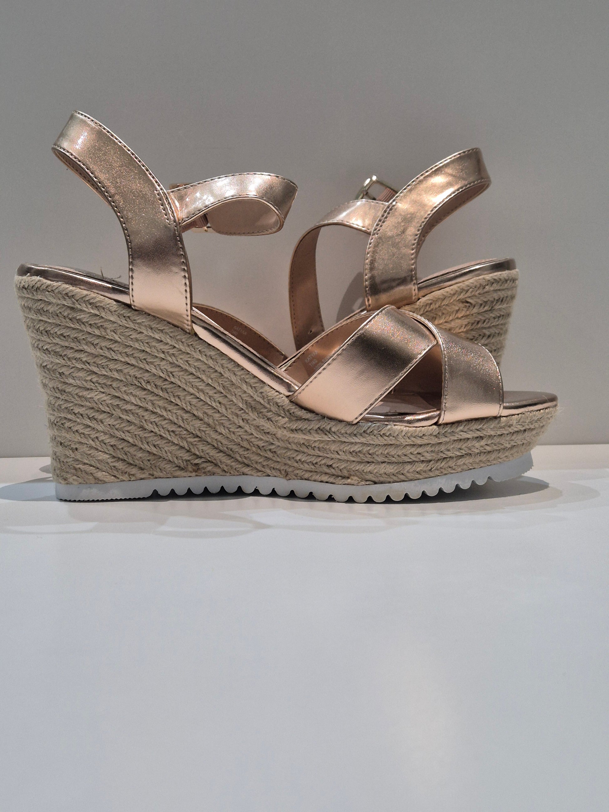 | Bronze wedge ankle strap shoes with a white anti slip sole. Secure strap, perfect for summer and outdoor events. |