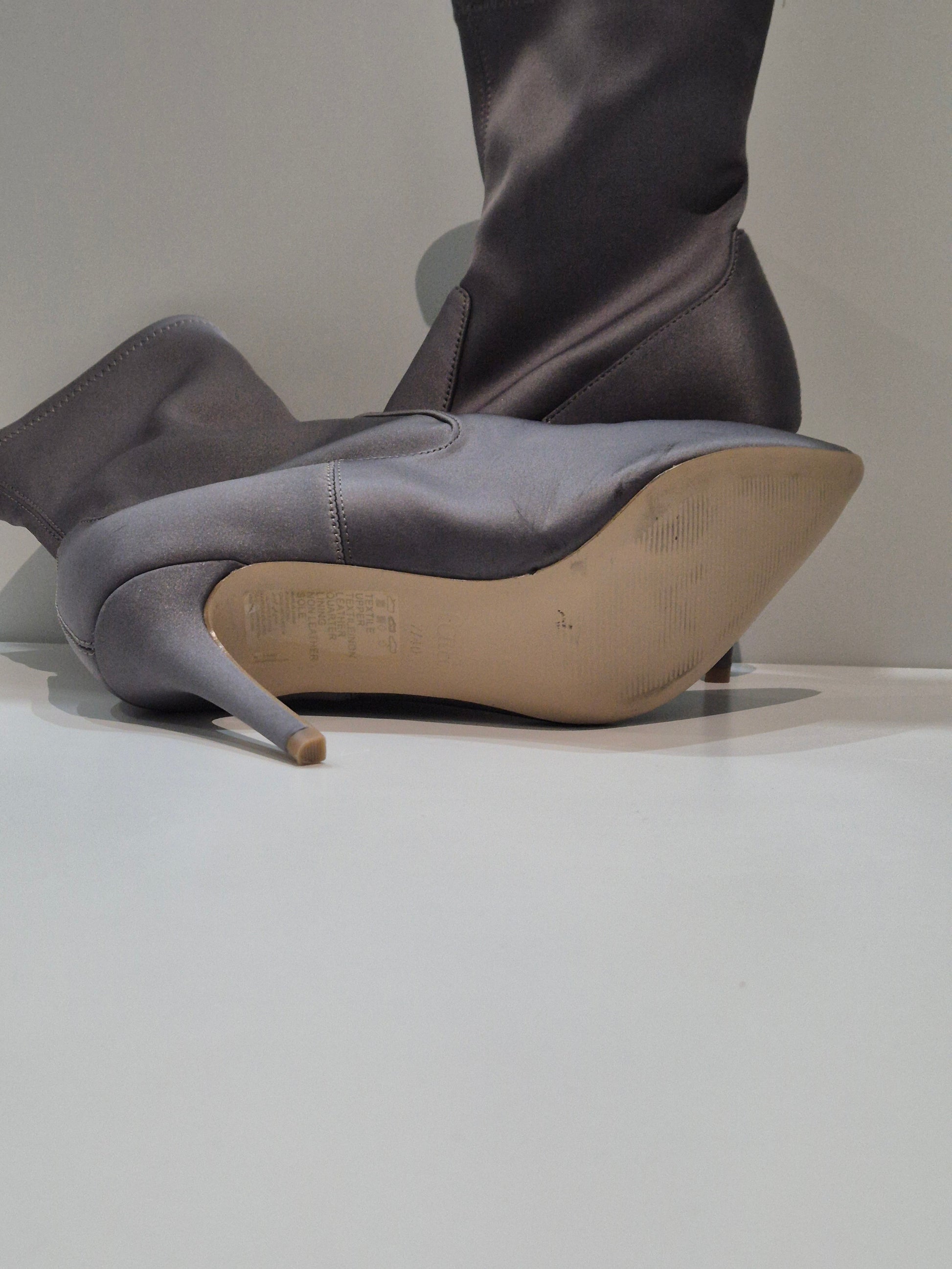 | Grey slip on ankle boots with a kitten heel, modern and stylish for day or evening events. |